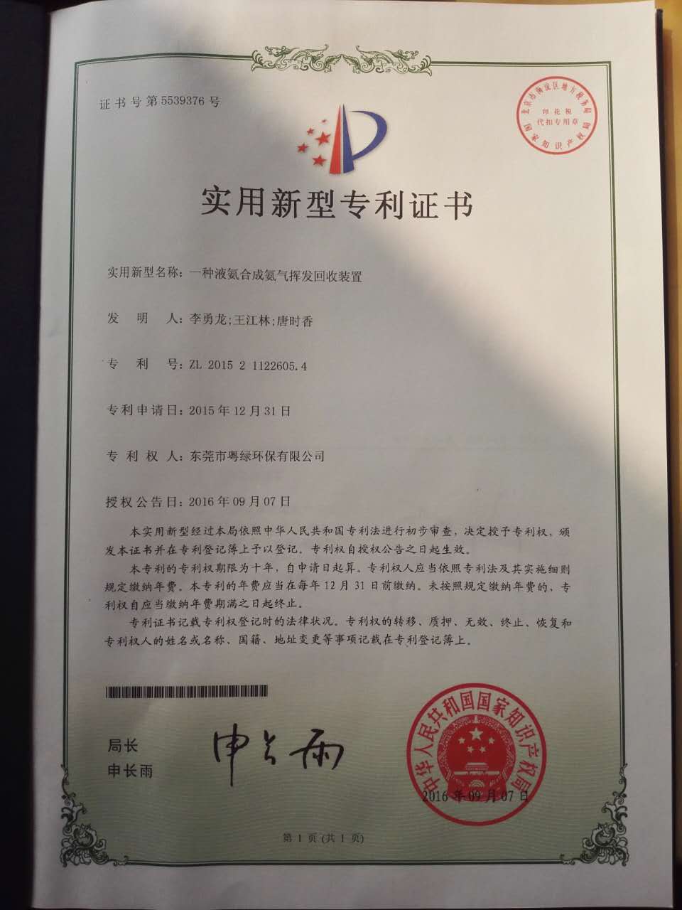 一種液氨合成氨氣揮發(fā)回收裝置專利證書