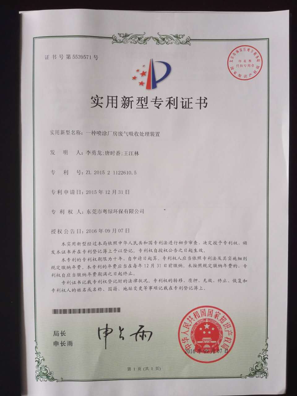 一種噴涂廠房廢氣吸收處理裝置專利證書